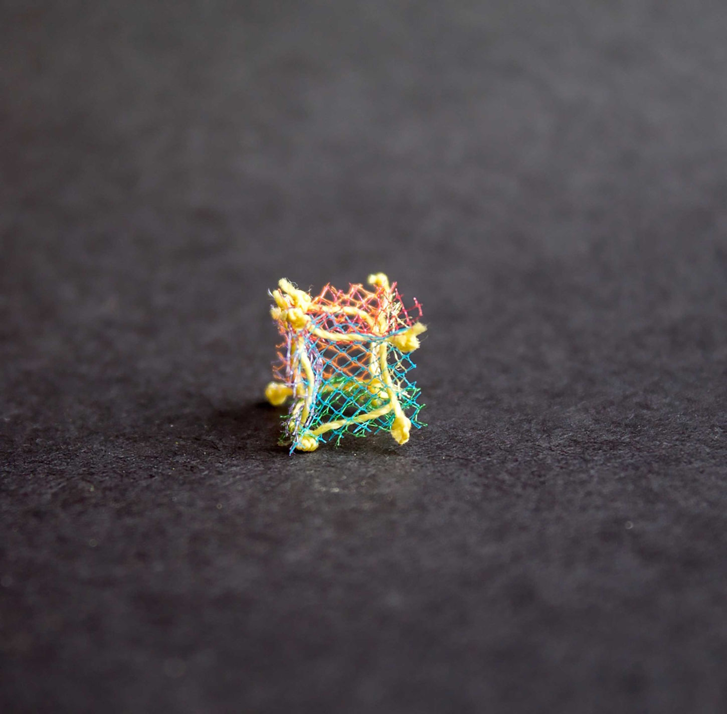 Inspired by early inquiries into visualization of 4-dimensional space through cube shape by Charles Howard Hinton in his book “A new era of thought” to create my artwork I’ve decided to focus on the idea of a ‘flattened’ 3d space. As in a 3-dimensional space a 2-dimensional plane has no “corners” to hide behind – so is a 4-dimensional space unfolding a 3-dimensional topology ultimately leaving no hidden nooks. In other words, 4-dimensional existence implies perceiving all sides of a structure at once. Translucent textiles enable the viewer to experience such implications. However, these concepts are challenged by elements of nature – the light is capable of constantly alternating the colors; moving around the structure endlessly transforms the appearance, educating the viewer about the ever-changing topology of the space. The primary and secondary colours become a blended visible spectrum where one colour no longer can be separated from the rest. This endless andlessness of forms, perceptions and concepts is at the heart of being a human. We know there is no bottom or top level to existence, yet we still push further and further with our futile desire to reach the “final frontier” of space-time, thought and being. This tiny sculpture is a testimony to our place in the universum – a visual example of how little we understand and at the same time how bottomless this little quantity is.